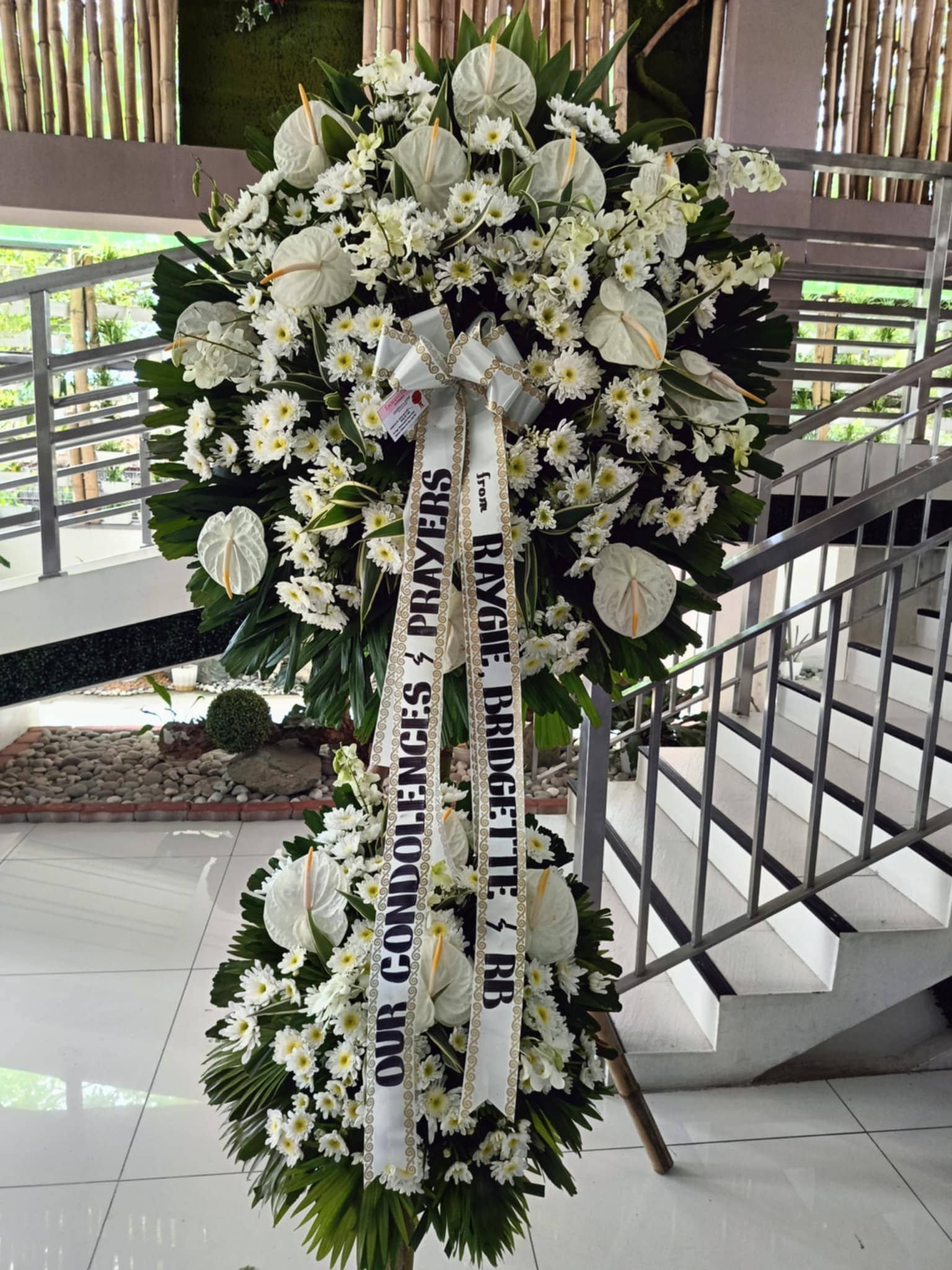 a special person in God's careOur gorgeous Red and White floor arrangement features the freshest red roses, white spider mums, white gladiolas, red carnations and more. Send an expression of your love and concern at this difficult time.Our florist's hand-design each arrangement, so colors, varieties, and containers may vary due to local availability.